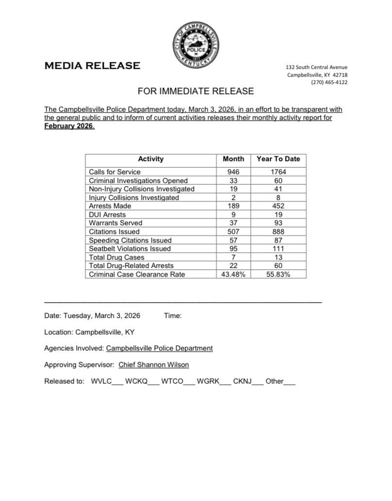 Campbellsville Police Department Monthly Activity Report: February 2026