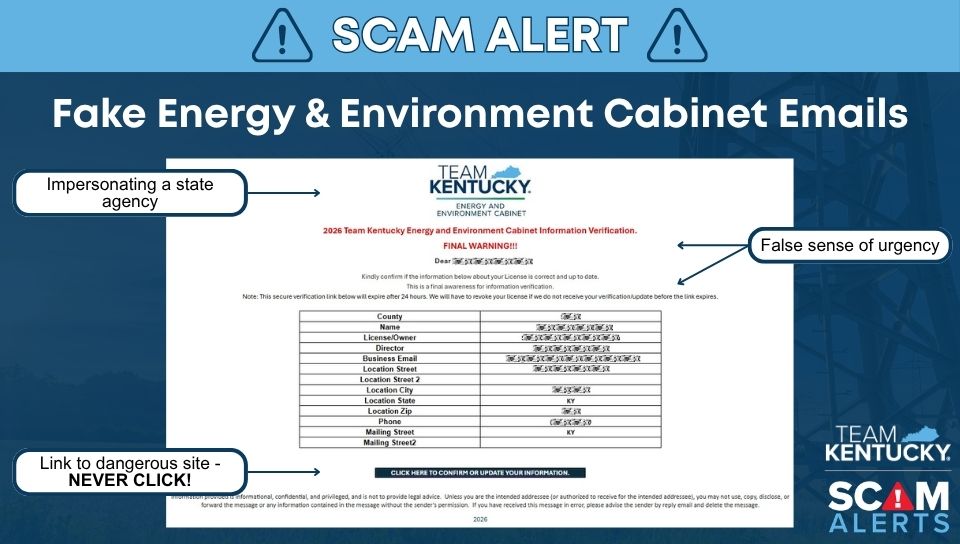 Fraudulent emails impersonating state agencies including the Energy and Environment Cabinet (EEC) are circulating, urging recipients to verify licensure details within 24 hours. Remember to use the Pause, Check, Protect […]