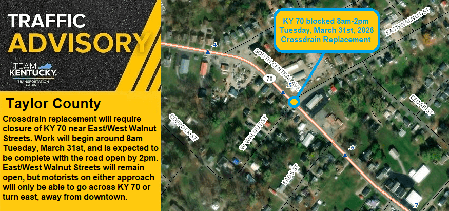 Traffic Advisory:  KY 70 Closure In Taylor County Near Intersection Of East And West Walnut Streets